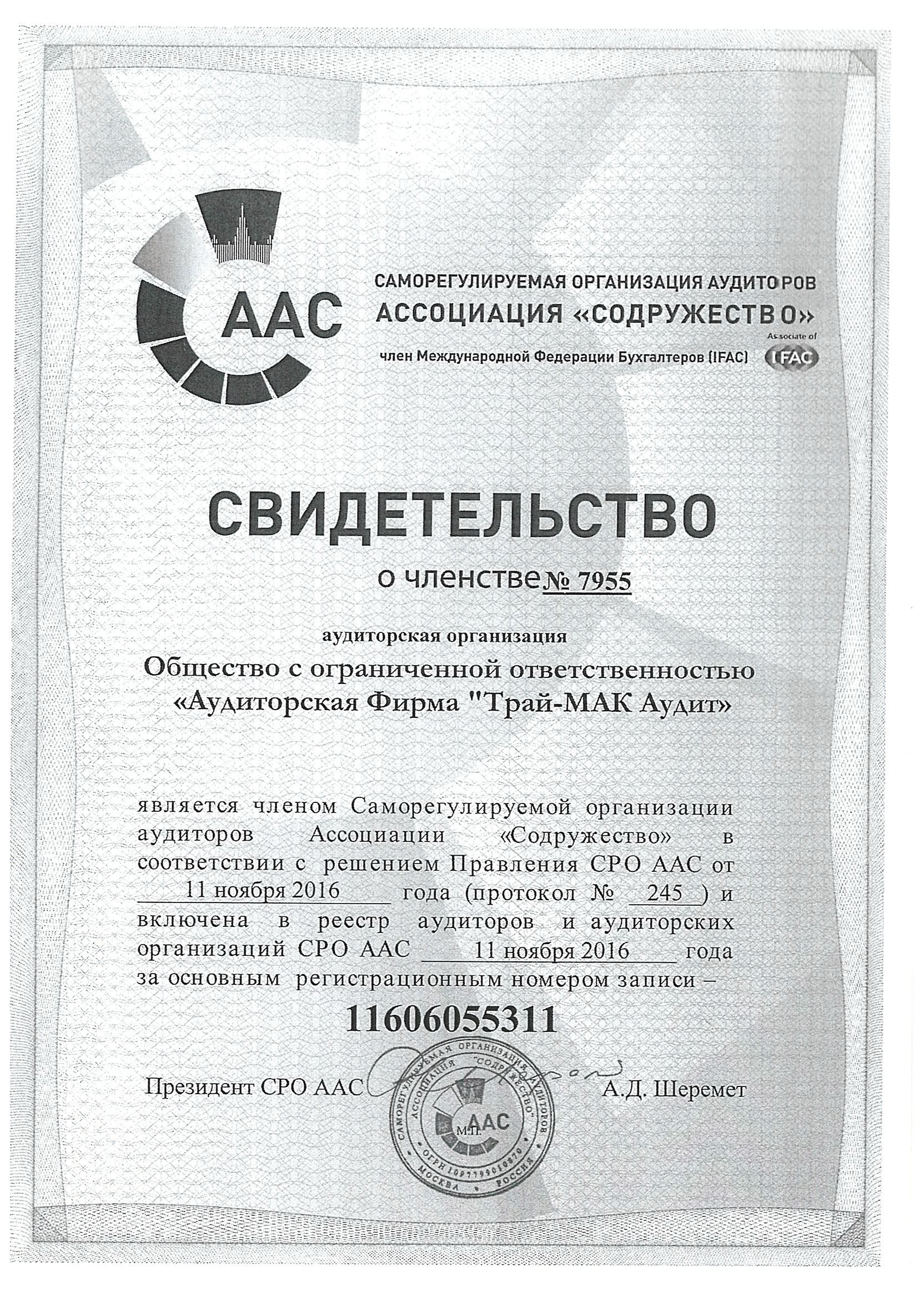 Компания является членом Саморегулируемой организации аудиторов Ассоциации "Содружество" в соответствии с решением Правления СРО ААС от 16.11.2016 года, протокол №245