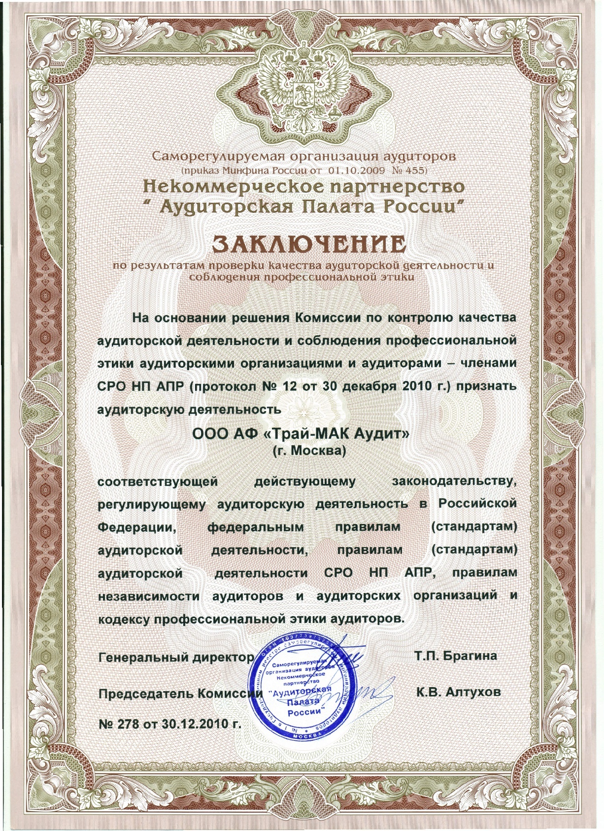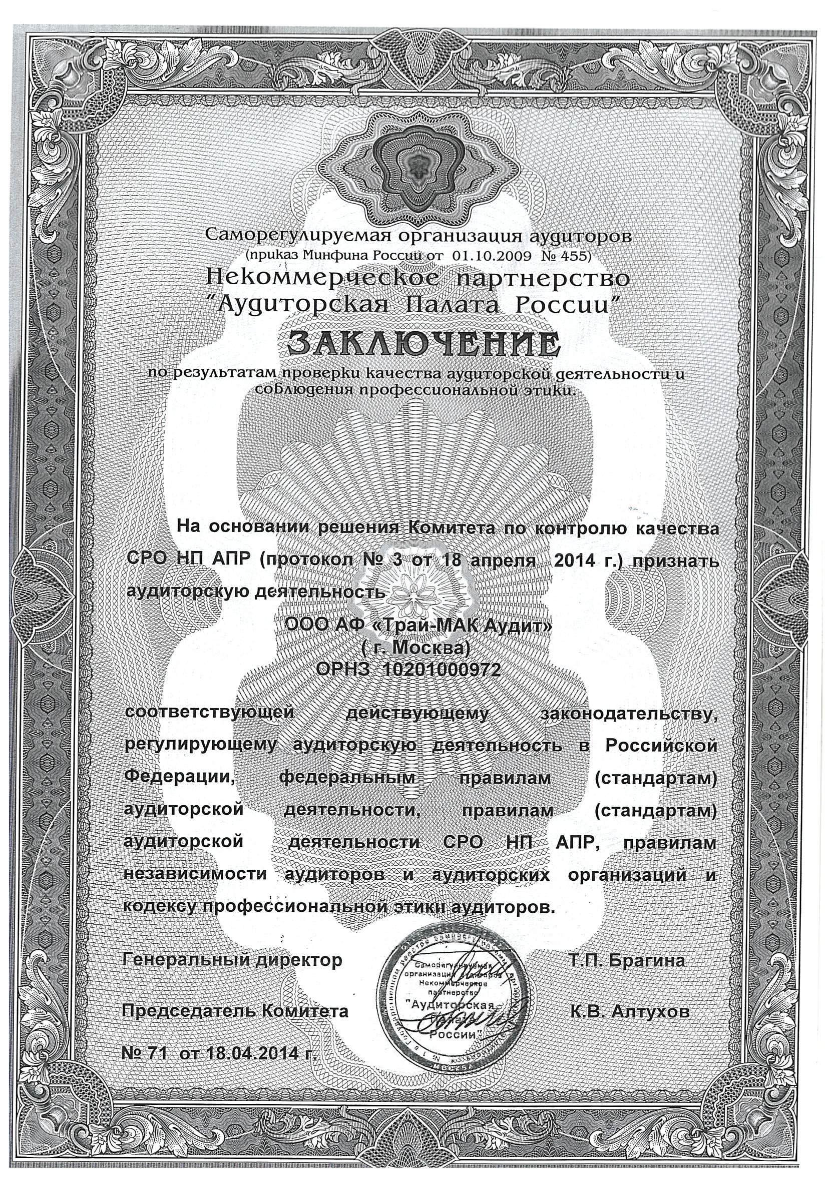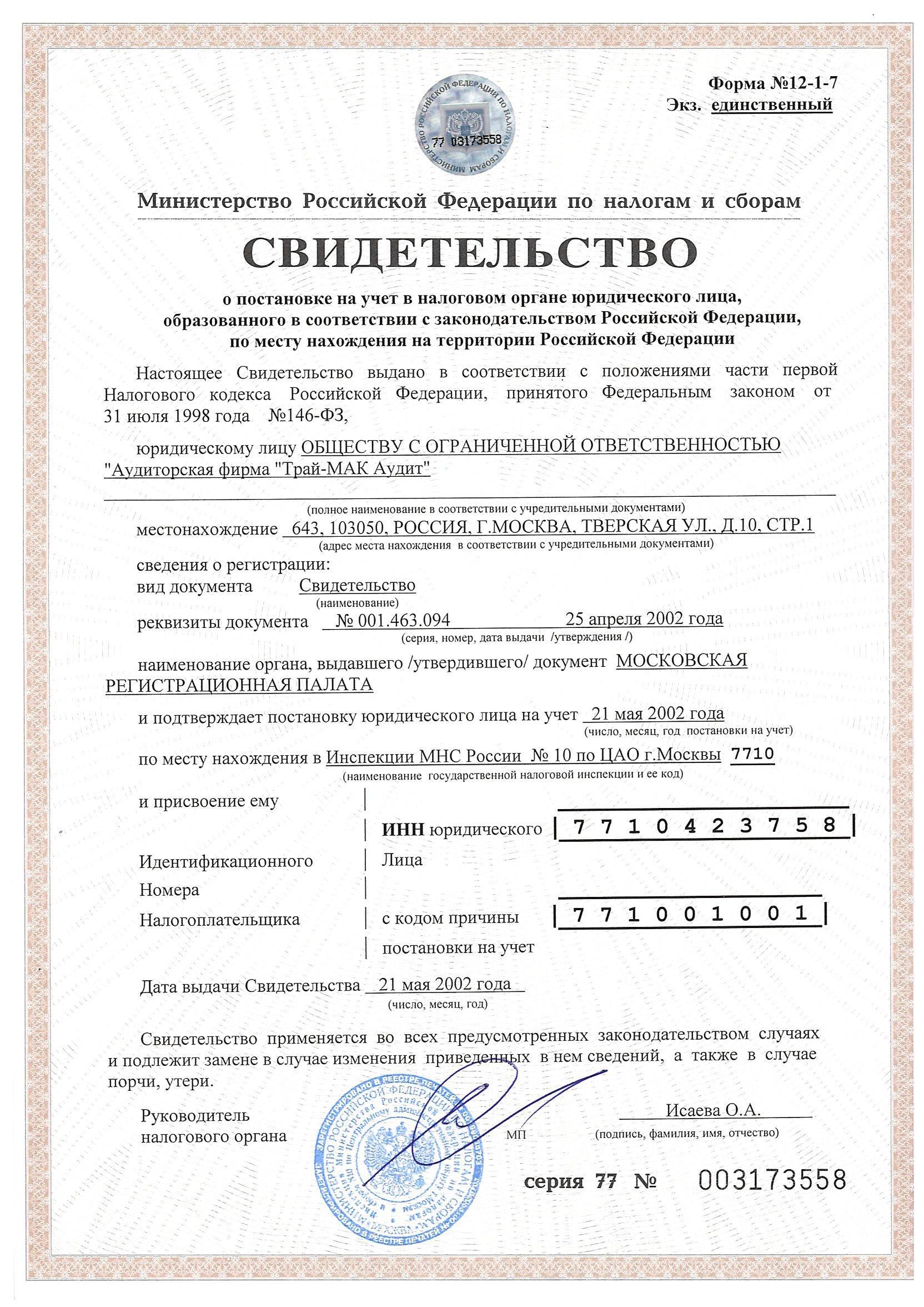 ООО "АФ "Трай-МАК Аудит" зарегистрирован 25.04.2002 года за основным государственным регистрационным номером 1037739482527