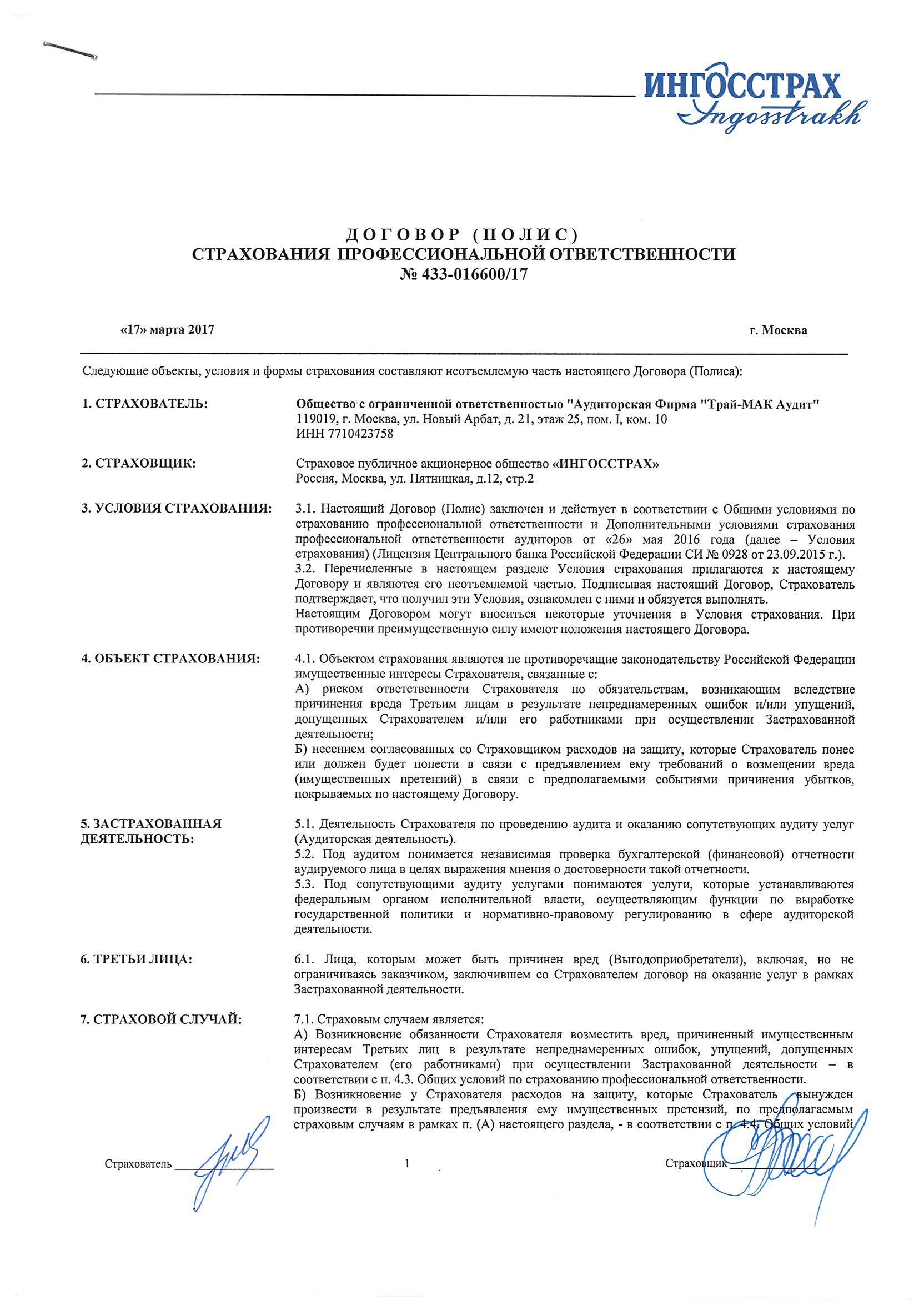 Профессиональная ответственность аудиторов застрахована с 2013 года в ПАО "Ингосстрах"